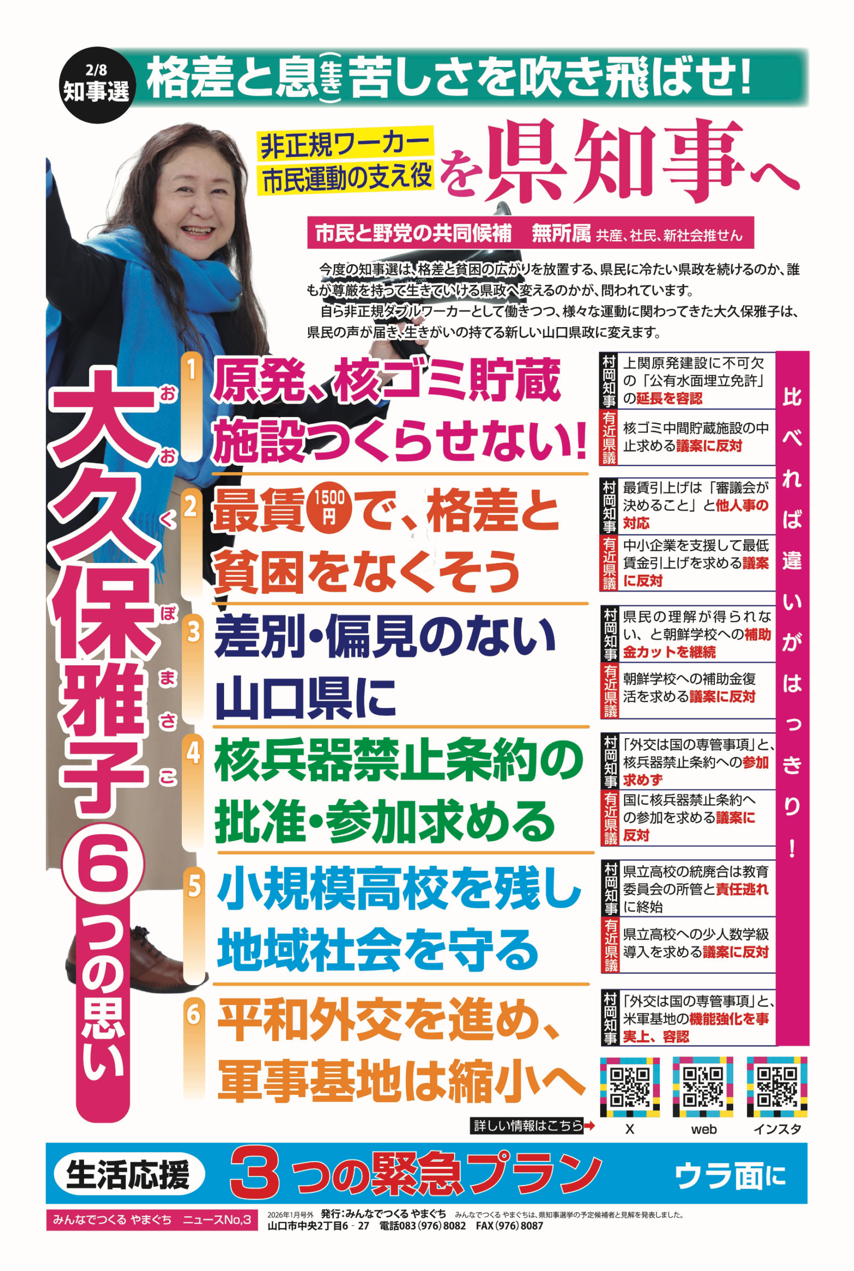 大久保雅子さんの政策をより詳細に示すチラシが出来上がりました。立候補を表明している他の2人との違いが一目瞭然です!