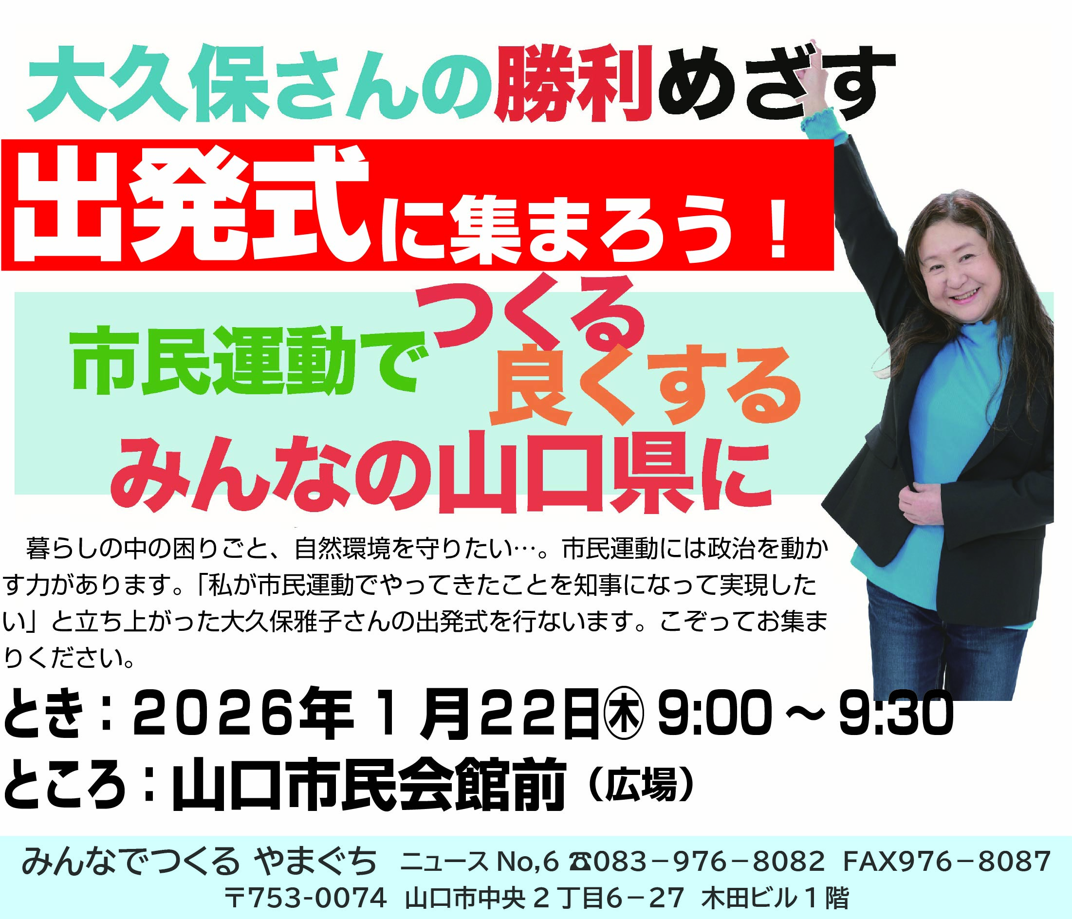 大久保さんの勝利めざす出発式の日程が決まりました。勝利に向けてみんなでにぎやかに送り出しましょう。